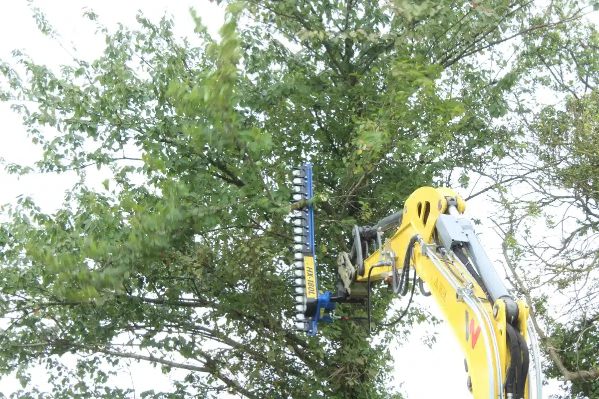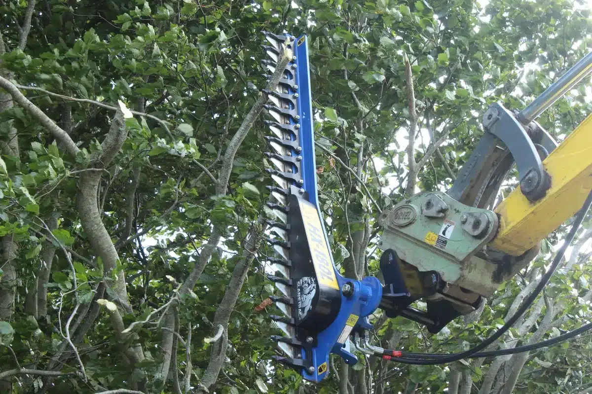 The hydraulically powered reciprocating finger bar allows for fast and neat cutting of hedges. For best results while heavy cutting the operator can use the slewing movement of the digger to cut through thick heavy growth, while for finer, lighter breasting of the hedge the operator can use the tracking movement to get the desired finish. Designed to allow cutting to take place at any angle between horizontal and vertical via the adjustable mounting bracket it allows the operator better access to those hard-to-get places like behind fences and allows the operator to cut close to and around obstacles such as telephone poles offering greater versatility compared to flail options. With a cutting thickness of up to 65mm the Slanetrac HX Series Mini Digger Finger Bar Hedge Cutter offers clean cuts allowing for neat tidy hedges with more satisfactory conditions for re-growth compared to flail cutting attachments as well as ensuring minimum disturbance for wildlife.